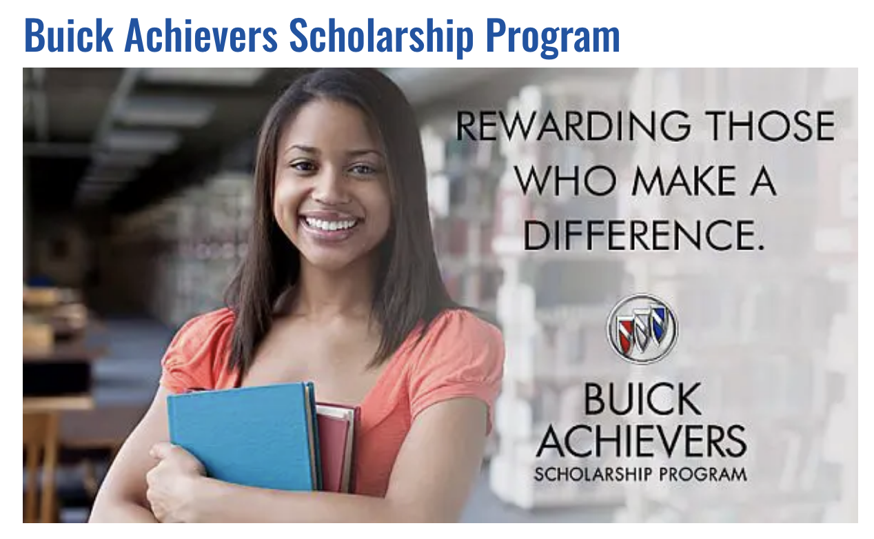 The Buick Achievers Scholarship is open for high school seniors, high school graduates, or current postsecondary undergraduate students. The Scholarship program is proudly funded by the GM Foundation. The General Motors college scholarships program rewards students who have succeeded both inside and outside of the classroom and who may not be able to attend college without financial assistance. It’s a reward for what you’ve made of yourself and the difference you are making for others. The Buick Achievers Scholarship Program is awarding 50 Buick Achievers Scholarships of up to $25,000 to the winning candidates.