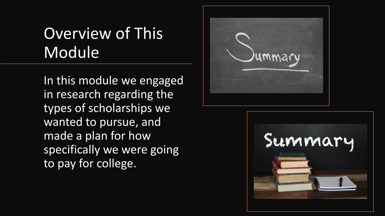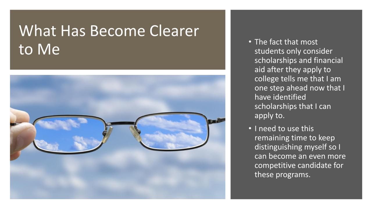 High school juniors participating in our program, engaged in thoughtful, thorough, and intentional college and scholarship research in March (see the slides). They identified the colleges to which they should apply and the scholarships for which they should pursue. All of this was done within the context of their ‘Body of Work.’ Consequently, rather than throwing darts at a proverbial college and scholarship dartboard, hoping for the best, they will be applying to a strategically identified group of colleges and for a strategically identified group of scholarships to which they best match.