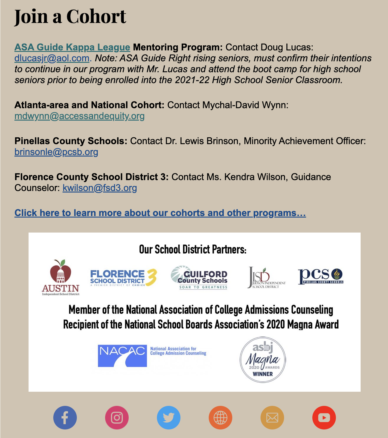 June 6 – 9 (Monday – Thursday), 9:00 am – 1:00 pm: Middle school boot camp. Daly sessions for students in grades 6 – 8. June 6 – 9 (Monday – Thursday), 5:00 pm – 9:00 pm: High school boot camp. Evening sessions for students in grades 9 – 12. June 13 – 16 (Monday – Thursday) 9:00 am – 1:00 pm or 5:00 pm – 9:00 pm: High school boot camp. Students in grades 9 – 12 may choose between day or evening sessions. To register, call (678) 395-5825 or email cpc@collegeplanningcohort.com. Need Writing Support?We will offer summer writing support for elementary school through high school students. For rising high school seniors, the sessions will provide guidance in selecting a Common Application topic; writing college essays and personal statements; and responding to writing prompts. During this time of holistic admissions, college essays are more important than ever. Email cpc@collegeplanningcohort.com for more information or to reserve your space. Want to Join a Cohort? ASA Guide Right Black Male Mentoring Program: Contact Doug Lucas: dlucasjr@aol.com Pinellas County Schools (FL): Contact Dr. Lewis Brinson, Minority Achievement Officer: brinsonle@pcsb.org Florence School District 3 (SC): Contact Ms. Kendra Wilson, High School Guidance Counselor: kwilson@fsd3.org What to join our National Cohort? Click here to learn more…