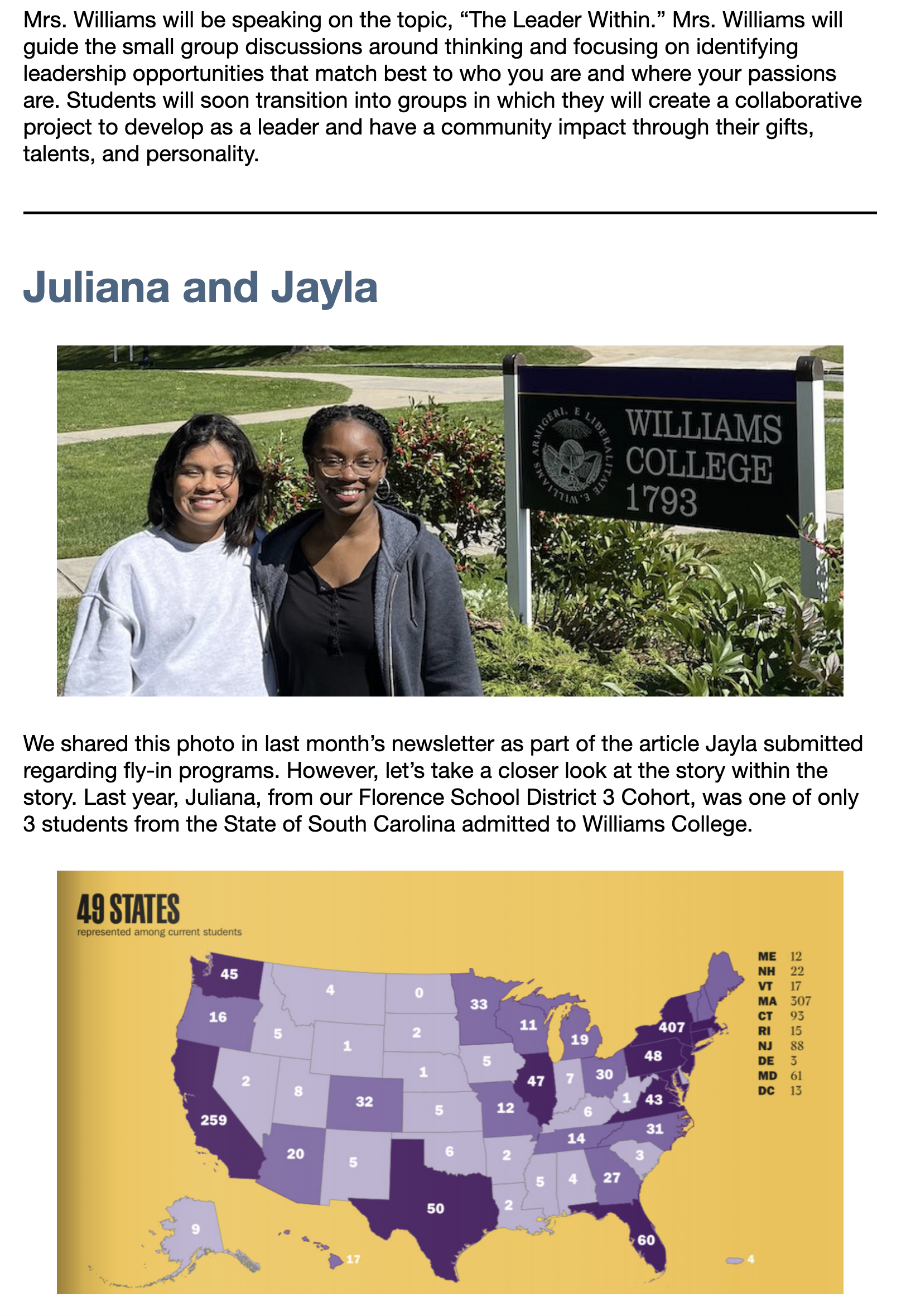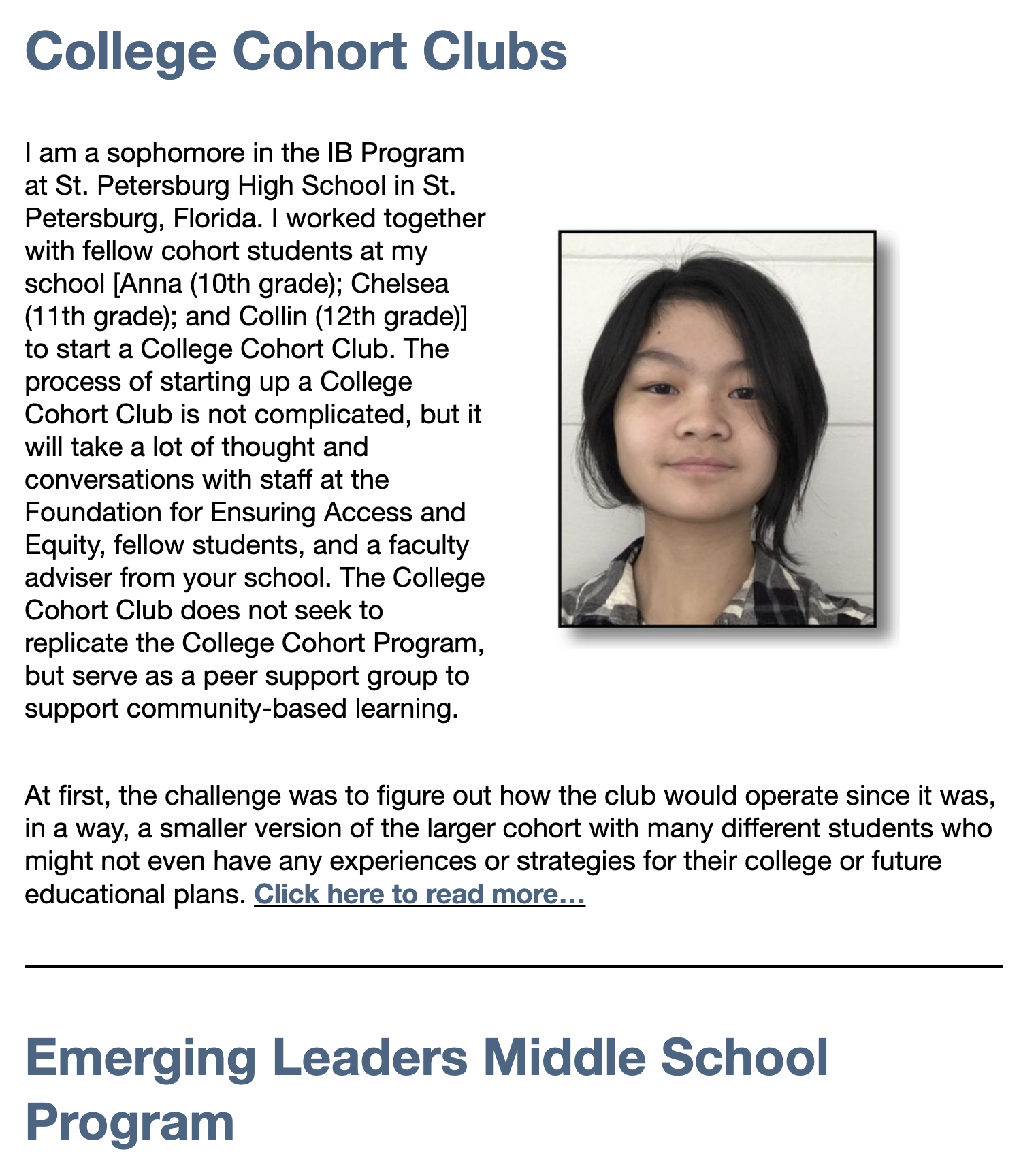 We are offering both morning and evening sessions for high school students. Space is limited. Click here to view dates, times, and to register… Student ProfileJocelyne L. (St. Petersburg High School) Hello, I’m Jocelyne. I am from St. Petersburg, Florida, and I serve on the youth leadership board with Omar, a high school junior from Dallas, Georgia. Omar is the Social Media Manager for our program. He is an incredibly hard worker and is having an incredible college-bound journey. He joined the cohort program as a high school freshman after reading an article about Kimberly Hadaway, a College Planning Cohort alumni who graduated from his high school (Paulding County High School Academy of Science, Research, and Medicine). He thought that it was amazing that she had been offered 6 full scholarships to some of the most prestigious colleges and universities in the country. However, what caught his eye in the article was that Kimberly, like himself, was a student of color from a single-parent, lower income family. He believed that if a student like him could earn multiple full college scholarships, that he too, could seize the opportunity.