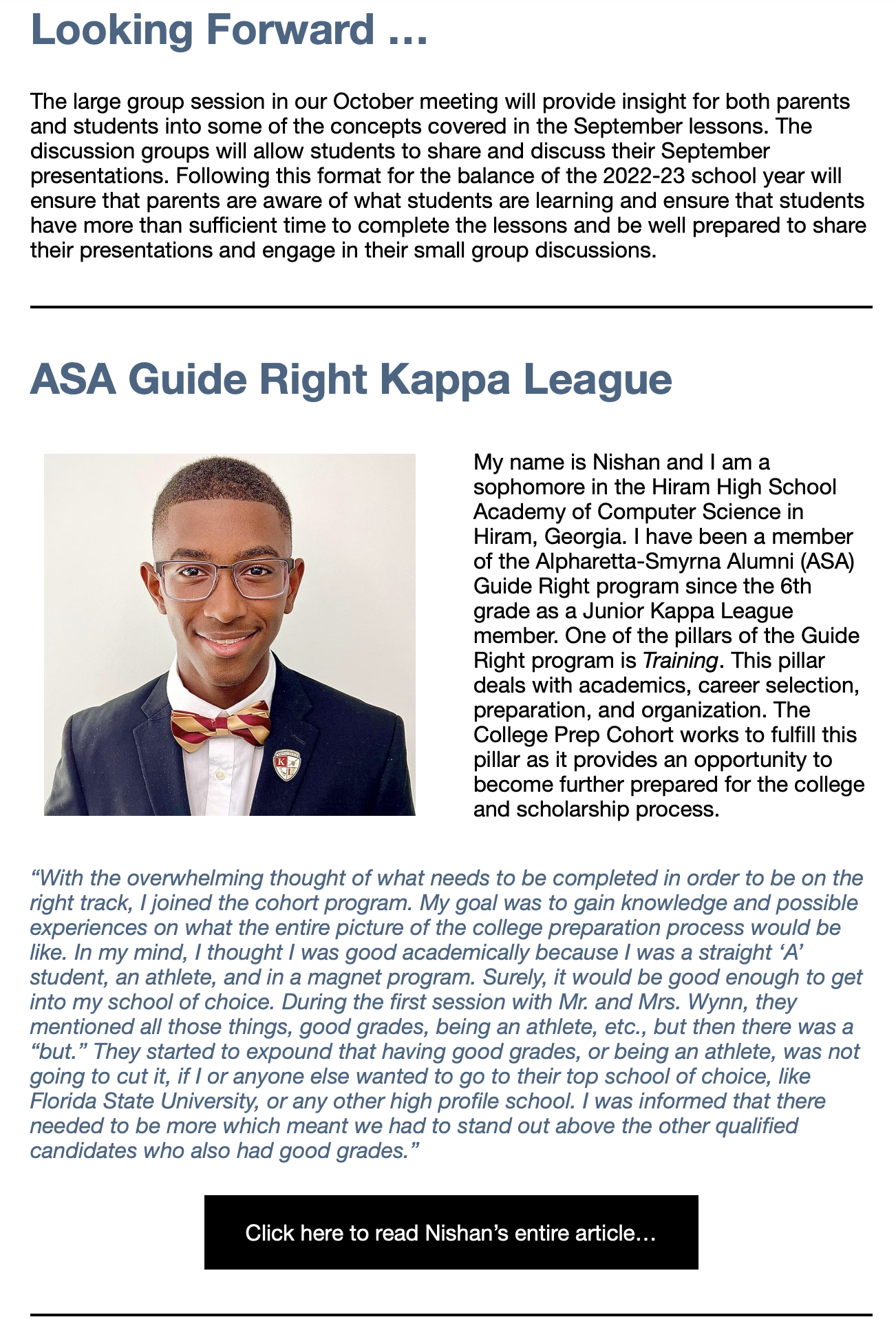 Kimberly’s story inspired him and her accomplishments motivated him to join the cohort and to commit himself to following all of the guidance offered by Mr. and Mrs. Wynn—after all, they were the experts who guided Kimberly. One of the first messages that resonated with him was that colleges are looking for more than just grades and test scores, so he committed himself to pursuing leadership opportunities and engaging in meaningful community service. He served as a College Planning Cohort intern and discussion group leader before applying for a position on the youth leadership board. He immediately had a community impact on the board through his mentorship of other first generation students and as a content creator for several video projects. READ FULL ARTICLE… Attention Cohort StudentsMychal Wynn (Northeastern ’79) All 2021-22 online classrooms will close at midnight, Saturday, May 28, 2022. Please complete your My Plan documents and finalize your year-end assessments. We have so very much enjoyed working with all of students in Georgia, Florida, North Carolina, South Carolina, California, and Indiana. You have worked so hard that we know that many of you are in a good place in your college planning. If you are a rising high school senior with plans of continuing in our program, there are many important actions for you to take throughout the summer in our June – August modules to ensure that you meet all of the fall college and scholarship deadlines. To continue in our online classroom, you must register for our senior cohort before May 28.Please note the following important dates:Sunday, May 29, 2022 (6:00 pm – 8:00 pm): We will host a FREE information session for rising high school seniors. We will provide an overview of what is covered in our high school senior curriculum, the one-on-one guidance offered, and the important actions that high school seniors should be taking throughout the summer months prior to the beginning of their senior year of high school. Click here to register…Monday, June 1, 2022 (7:00 am): Our online classroom opens for rising high school seniors. Monday, August 1, 2022 (7:00 am): Registration opens for joining our 2022-23 cohort.Thursday, September 1, 2022 (7:00 am): Our online classroom opens for students in grades 9 – 11.Would you like to earn leadership and community service? Volunteer to serve as a high school or college intern for one of our college planning boot camps. Email us at cpc@collegeplanningcohort.com. Summer College Planning SupportMychal Wynn (Northeastern ’79) Each summer, we develop our summer programming based on the needs of our school district partners and inquiries received throughout the school year. This summer, we will be offering: - One-on-one support for rising high school seniors in developing comprehensive senior-year college admissions strategies and assistance in selecting essay topics and finalizing college essays prior to the beginning of a stressful senior year.