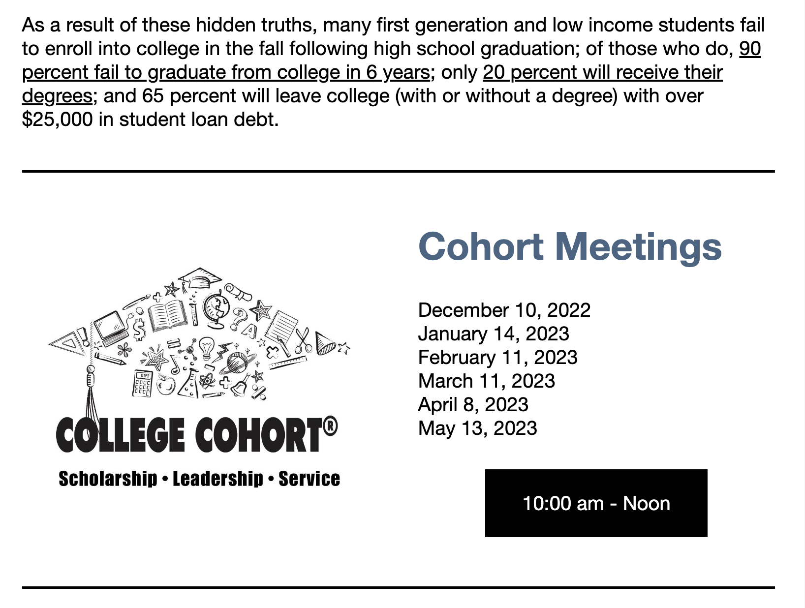 Contact us and tell us what you need: cpc@collegeplanningcohort.com or call (678) 395-5825 Facebook Postings…We post important content regularly to our College Planning Cohort Facebook Page. Please ‘Like’ and ‘Share’ our page so that you stay up to date on the latest in college planning news. Mark Your Calendar Monthly Cohort Meeting: The second Saturday of each month. May 14, 2022 (Saturday), 10:00 am – Noon: Senior Recognition and Final Cohort Meeting of the 2021-22 School Year (click here to register; Meeting ID: 884 7893 8939). The session is opened to anyone who would like to share in our celebration of seniors.