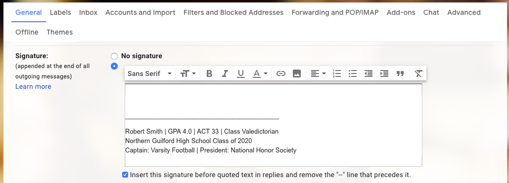 - If you have impressive academic credentials and class rank, you may enter them on the second line with your name, so that you have an email signature as show below