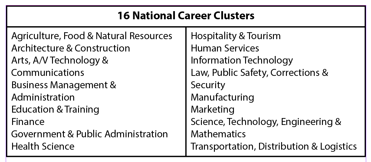 The table above lists the 16 career clusters reflected in The National Career Clusters Framework, which serves as an organizing tool for CTE programs. The clusters represent 79 different career pathways. If you are entering, or have already entered high school through one of these career clusters, then focus your efforts on taking the Interest Profiler presented in the chapter, “What Are Your Interests?” to confirm that your chosen pathway is aligned with your interests.
