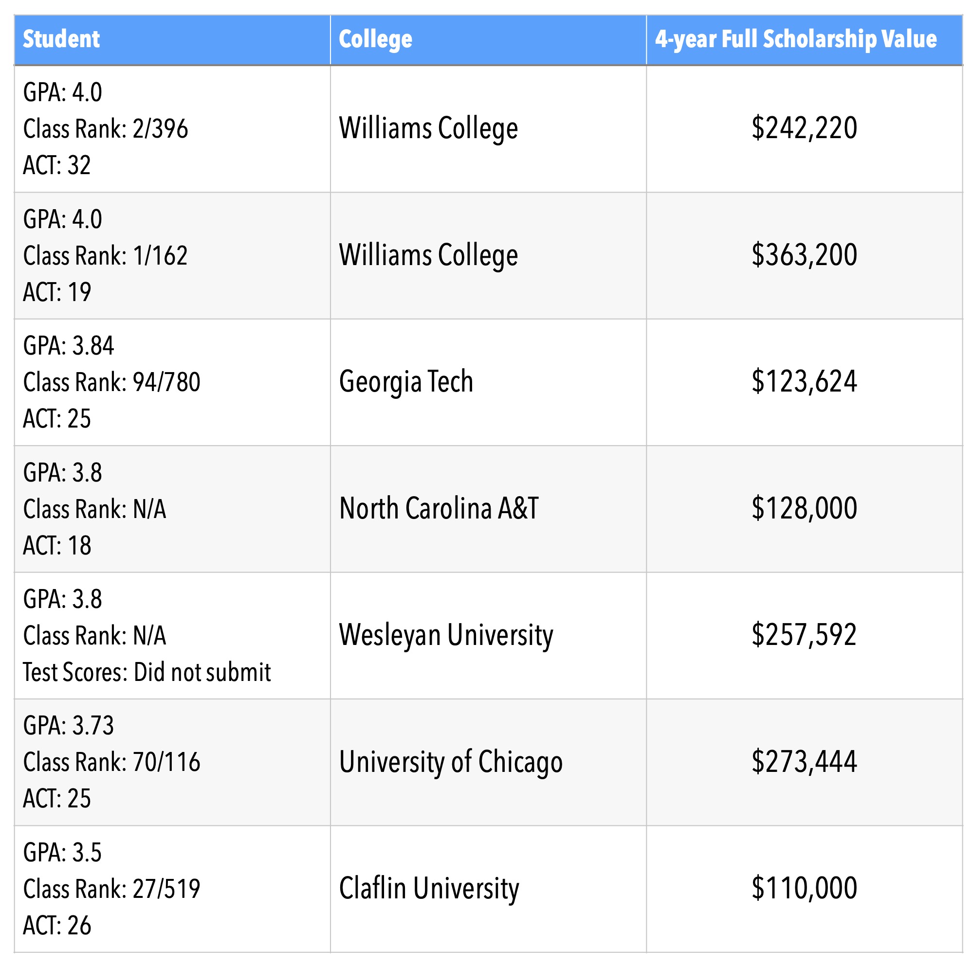 - We will consider published admissions data, together with our experiences, to recommend a matched group of colleges and scholarships.