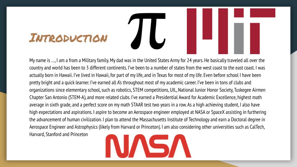 Following is the introductory slide and the summary slide from the college planning document created by a rising 9th grader from a military connected family who attended our 2021 Judson ISD boot camp for rising 9th graders. The slides contained between the introduction and the summary represent the student’s plan, which was shared with other students attending the boot camp. Each student’s college-bound plan is supported by a narrative document and supporting forms reflecting the research, critical thinking, and step-by-step actions conceptualized as the pathway to successfully pursuing his or her college/career aspirations.