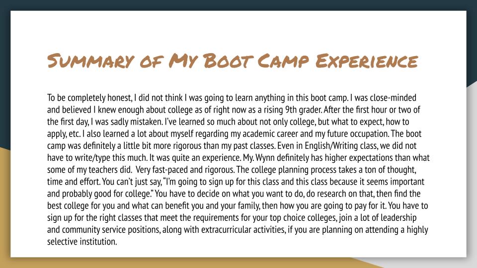 We felt the boot camp was extremely valuable, helpful, informative and necessary. Too many of our scholars are unaware of the steps that are necessary before attending college and are somewhat clueless about preparing before it is too late. Our daughters did not realize the value of a résumé until they attended the boot camp. They are now familiar with some of the requirements that are needed to get into the college or university of their choice. They also have a pathway to guide them along the way throughout their middle and high school years.Parent of Middle School Student